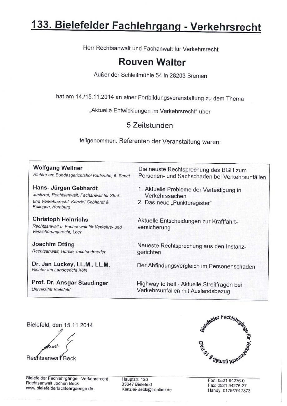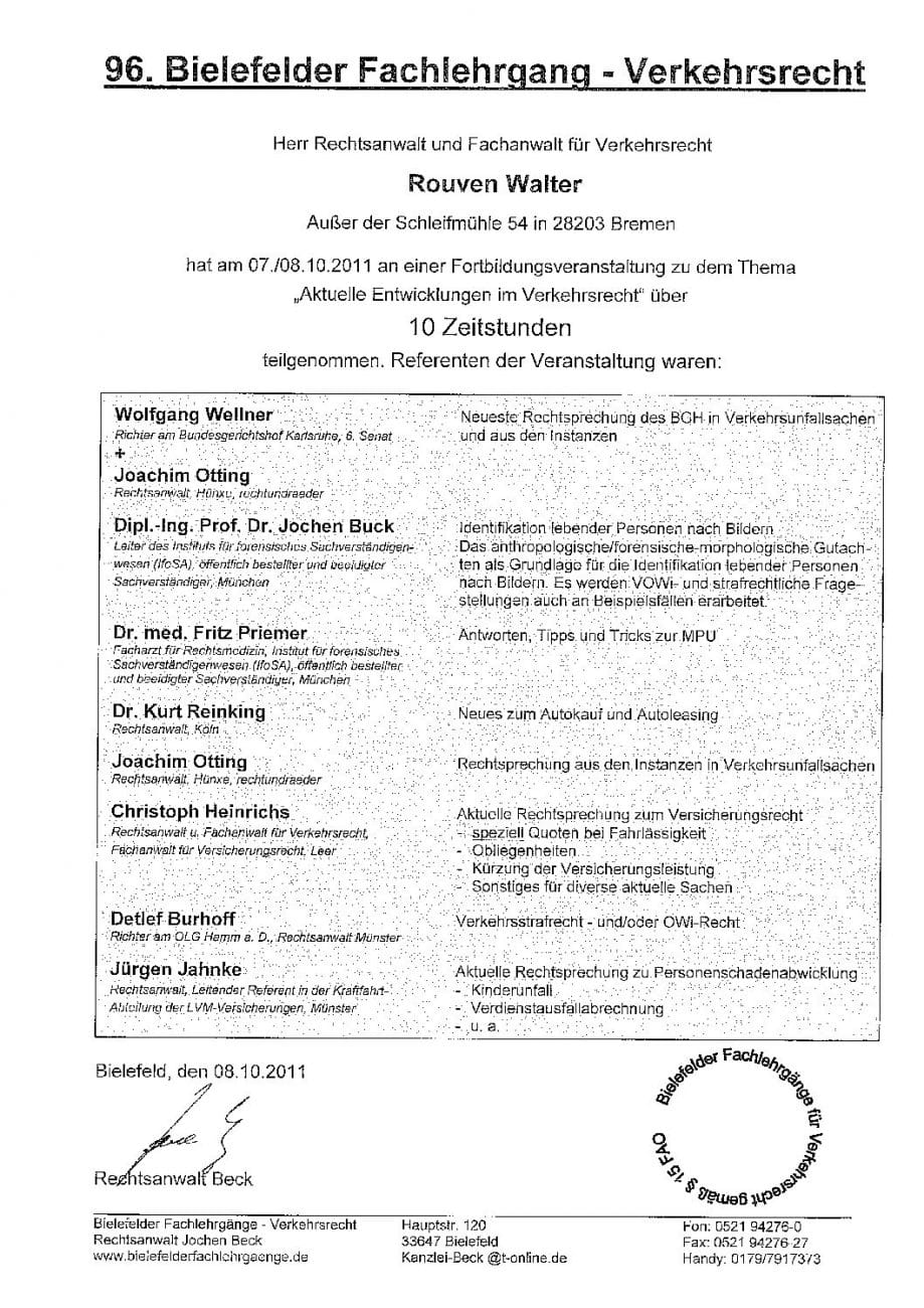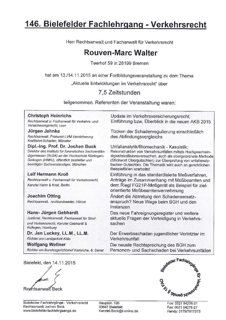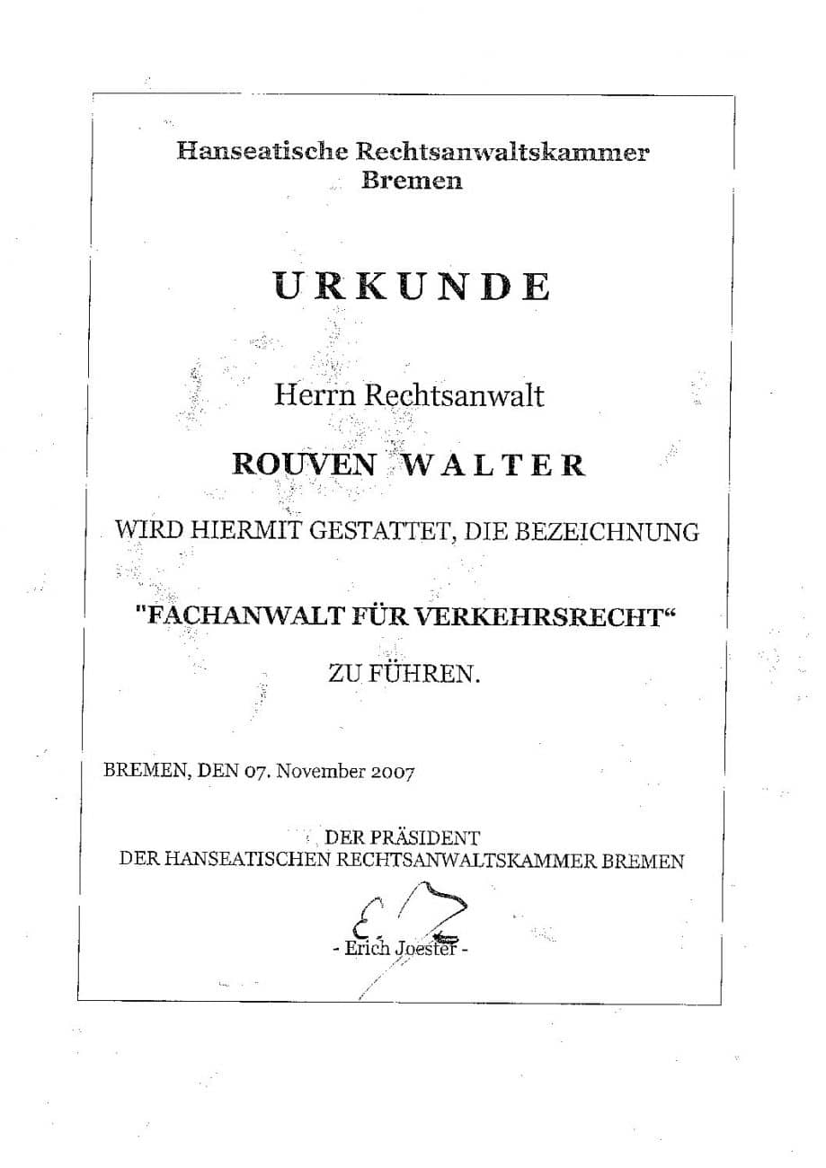2007 erhielt ich – als einer der ersten Rechtsanwälte in Bremen – den Titel Fachanwalt für Verkehrsrecht von der bremischen Rechtsanwaltskammer verliehen. Gemeinsam mit meinem Kollegen Dr. Dr. Wambach, Fachanwalt für Medizinrecht, betreiben wir als Partner die Fachanwaltskanzlei für Personenschäden in Bremen. Engagierte Parteivertretung und Einfühlungsvermögen sind in diesem Bereich unerlässlich.