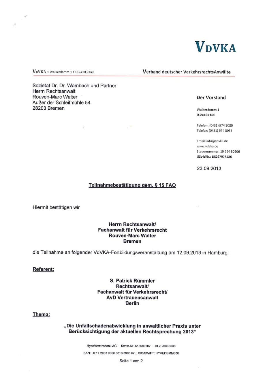 • Seit 2012 Mitgliedschaft im Verband deutscher Verkehrsanwälte e.V.